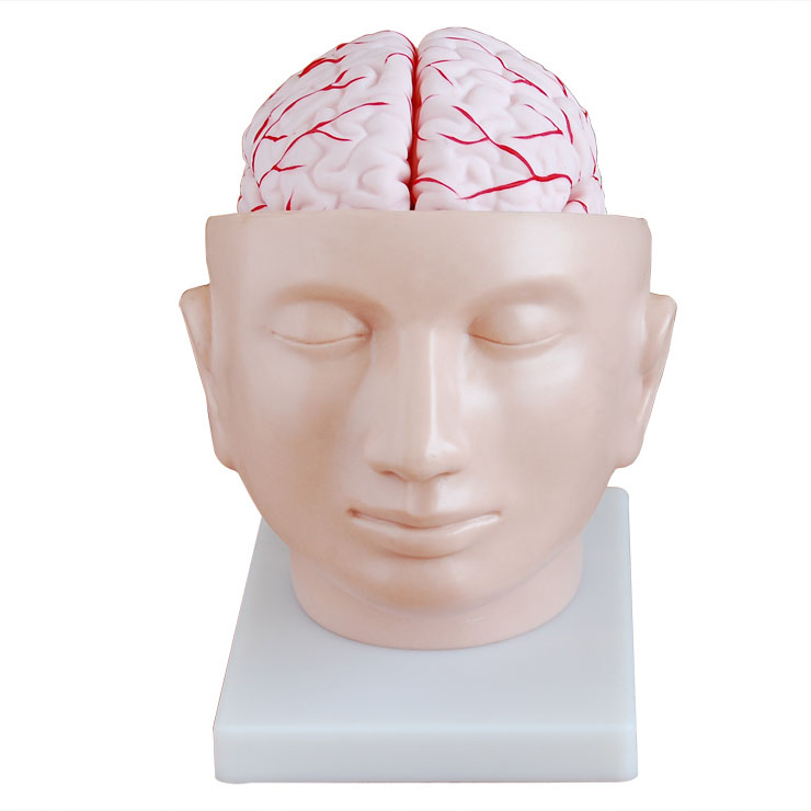 这款模型显示颅内的脑结构,颅基之上头部可平行打开。脑模型可中分以显示脑动脉和可拆卸脑底动脉。两半都可分解为: 前顶叶、颞枕叶、脑干、小脑置于基架上。自然大,分成9件。