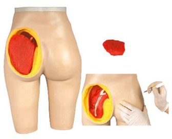 体表解剖结构准确明了,为更准确的注射操作提供了科学依据。结构包括:近端股骨、大转子、髂前上棘、髂后上棘及骶骨。 左臀部外上四分之一可卸下,便于观察确认其内部结构、臀中肌、臀大肌的肌肉、坐骨神经和血管结构。 可进行三种肌肉注射方法的训练:背侧臀部注射法、腹侧臀部注射法和骨外侧肌注射法。 材料采用进口塑胶弹性体材料,由不锈钢模具经高温浇注而成,手感质地真实,经久耐用,进针痕迹不明。臀部肌肉解剖模型