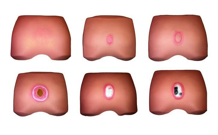 1、ZH-RC-4高级压疮病情演变模型具有六张臀部外皮,分别显示压疮的动态变化,包含淤血红润期、炎症浸润期、浅度溃疡期、坏死溃疡期等不同阶段。2、模型可配戴在学员或者护理人身上,使教学更加生动形象逼真。2、可进行不同阶段压疮的评估、伤口的长度、深度的测量,以及进行治疗与护理清洗。